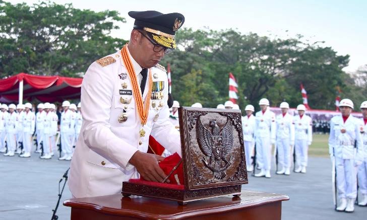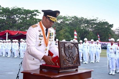 BANDUNG – Gubernur Jawa Barat (Jabar) Ridwan Kamil memimpin upacara penurunan bendera…