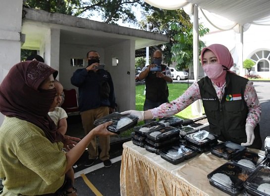 KOTA BANDUNG -- Ketua Umum Jabar Bergerak Atalia Ridwan Kamil membagikan nasi…