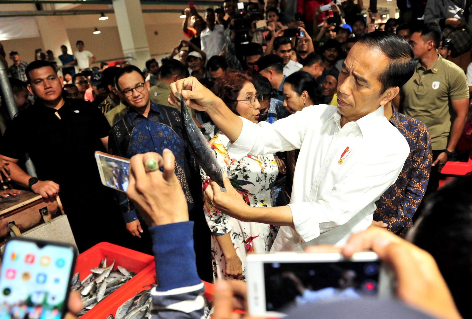 Presiden Jokowi menawar seekor ikan usai peresmian PIM Muara Baru, di Koja,…