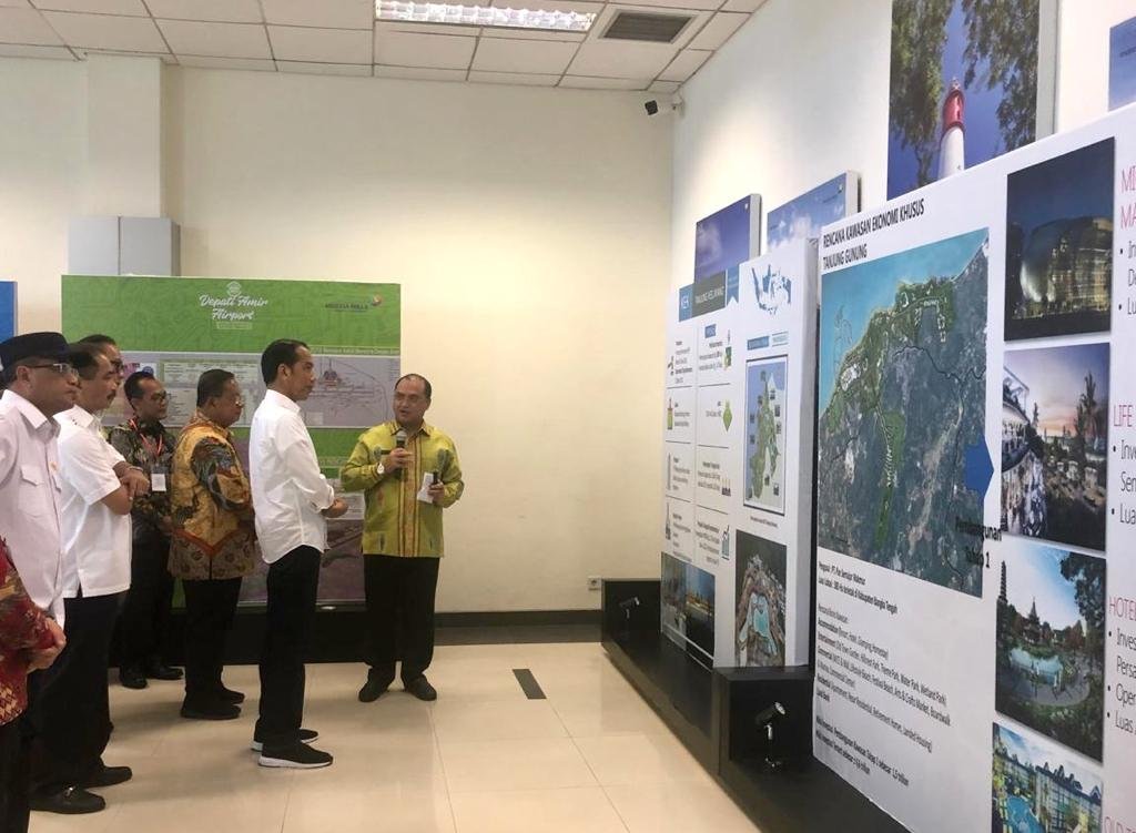 Presiden Jokowi mendapatkan penjelasan tentang maket KEK Tanjung Kelayang, di Bandara Depati…