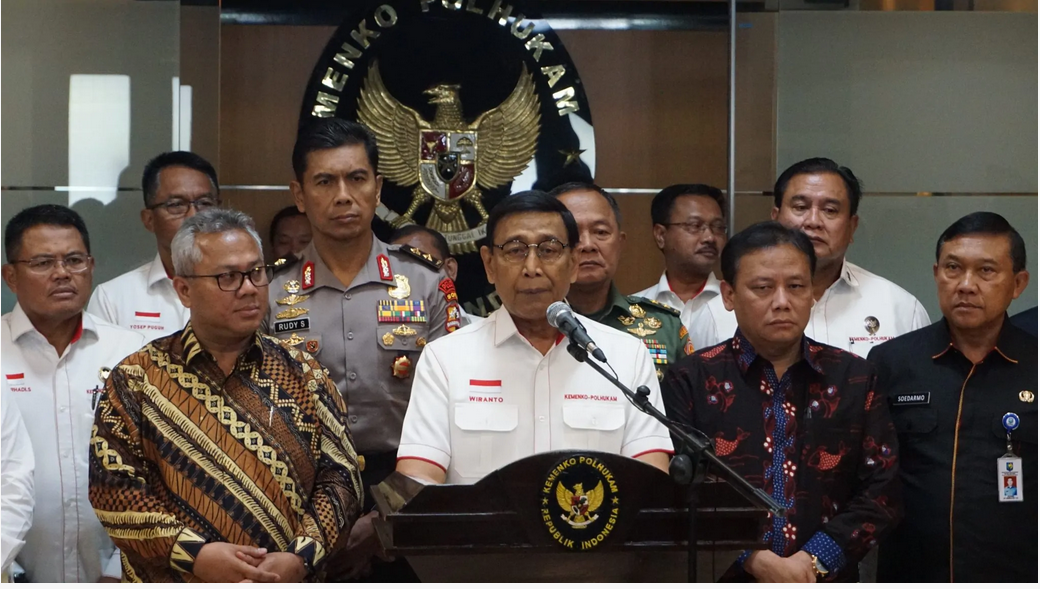 Menko Polhukam Wiranto didampingi Ketua KPU dan Ketua Bawaslu menyampaikan keterangan pers,…