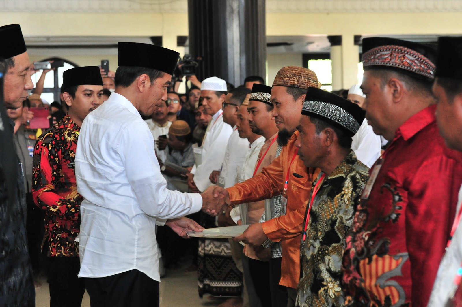 Presiden Jokowi menyerahkan sertifikat tanah wakaf, di Masjid Baiturrahman, Limboto, Kabupaten Gorontalo,…