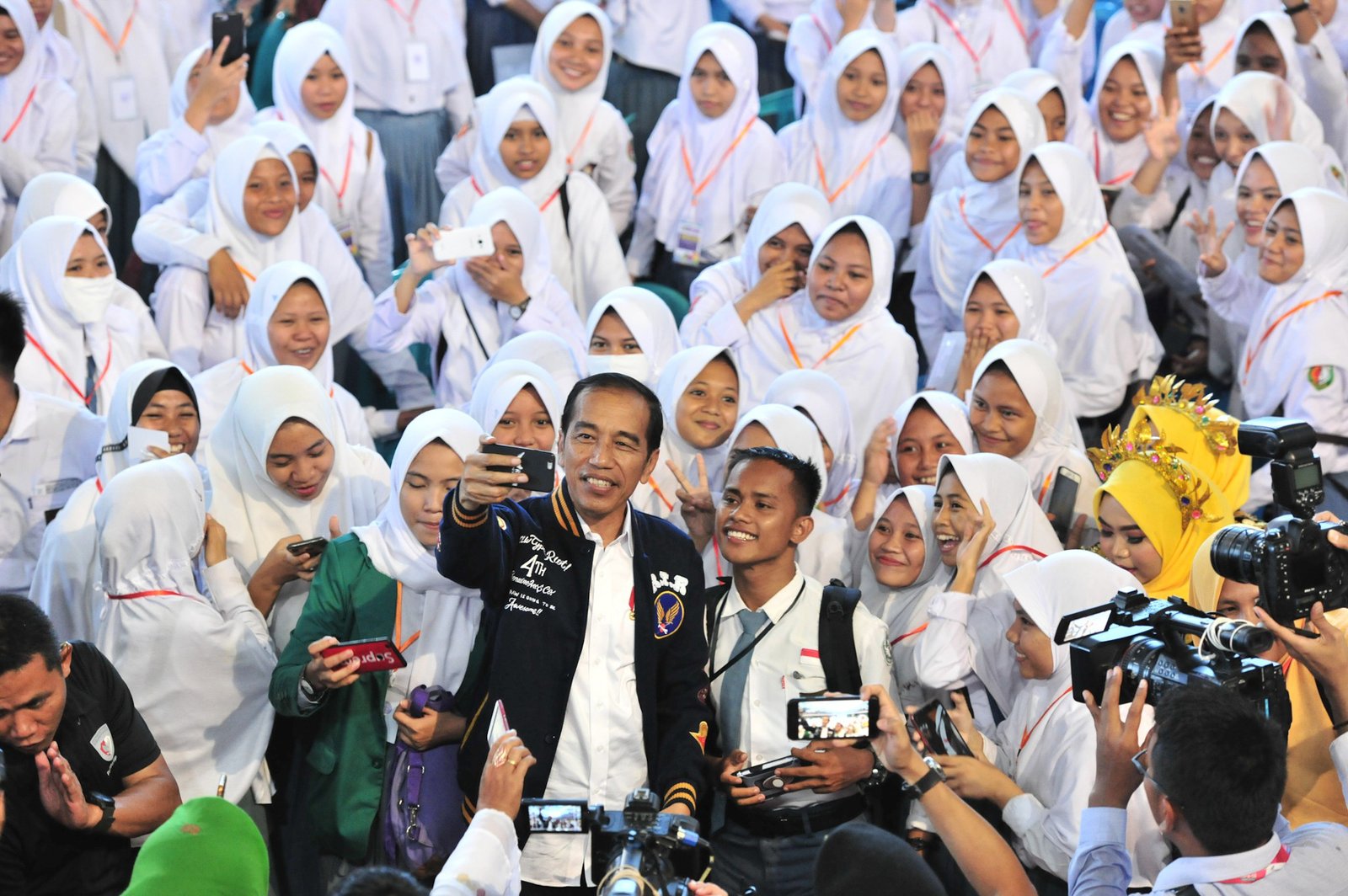 Presiden Jokowi berselfi ria bersama para siswa-siswi penerima KIP, di Gelanggang Olahraga…