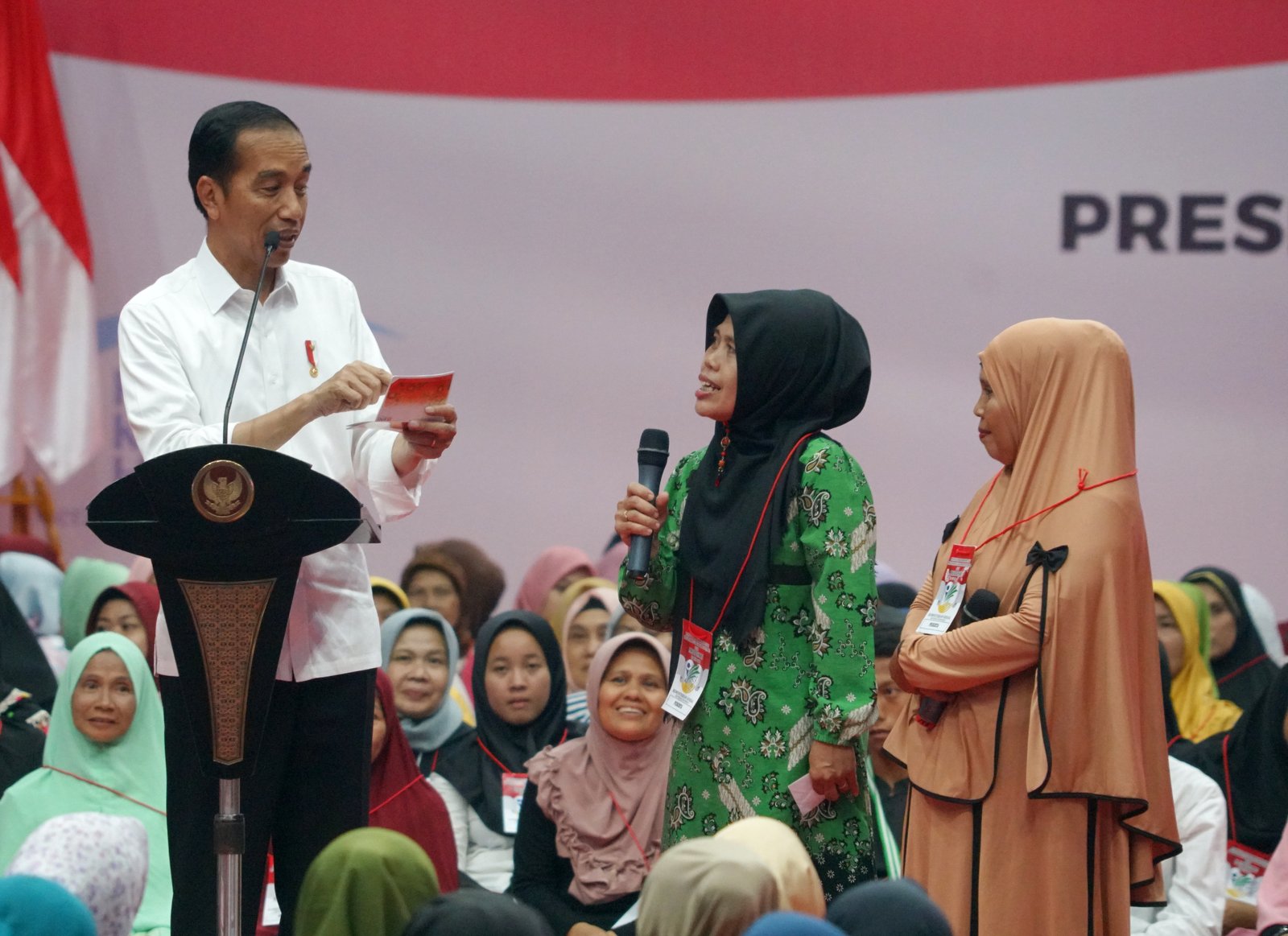 Presiden Jokowi berdialog dengan penerima PKH dan BPNT, di GOR Laga Tangkas,…