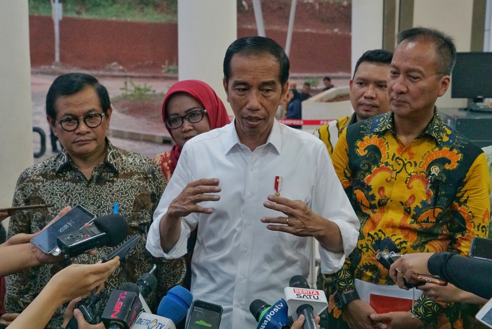 Presiden Jokowi didampingi Seskab dan Mensos menjawab wartawan usai menghadiri acara Penyaluran…