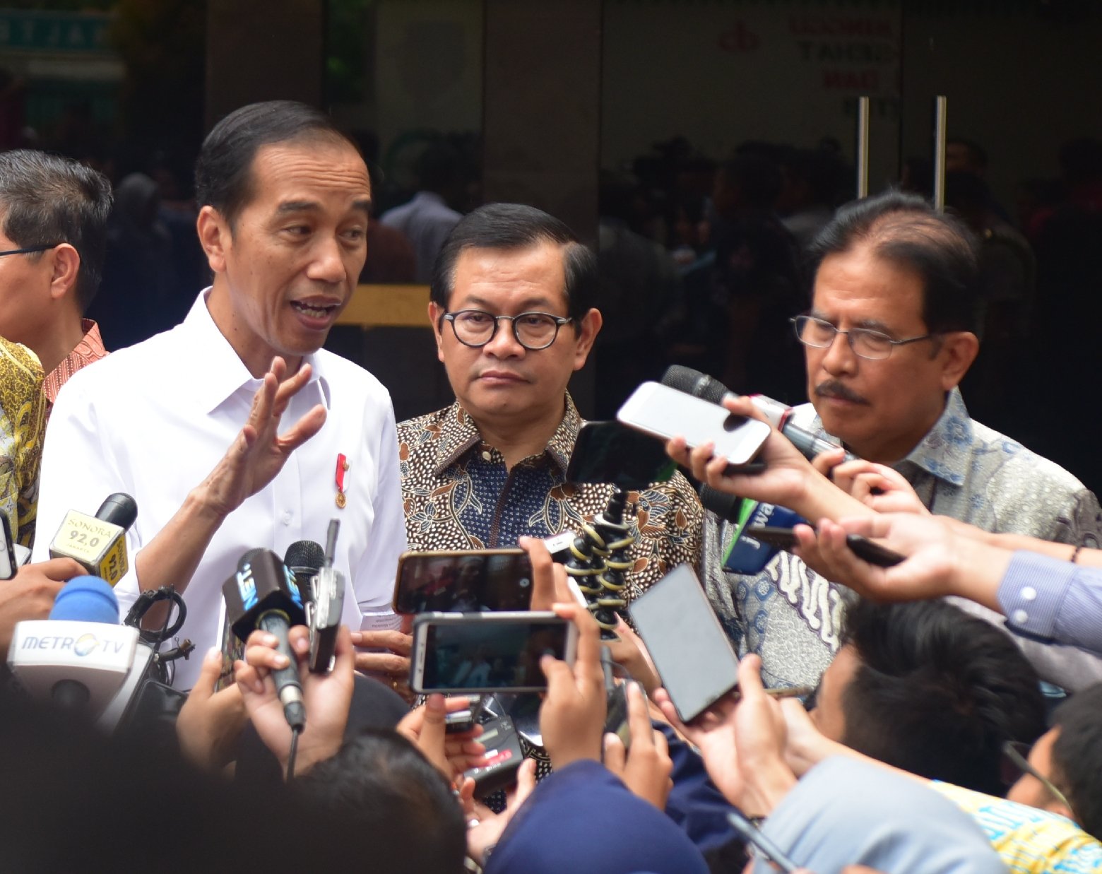 Presiden Jokowi didampingi Seskab dan Menteri ATR menjawab wartawan usai menghadiri acara…