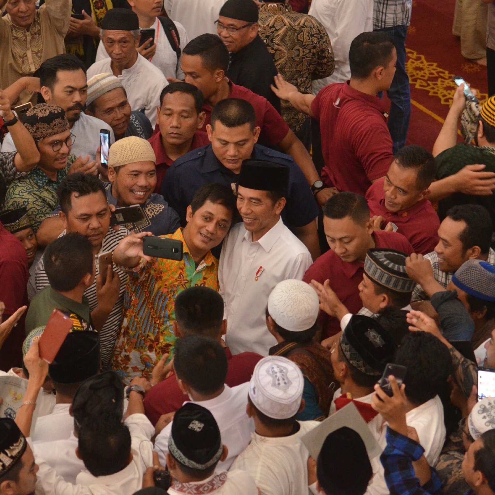 Presiden Jokowi melayani permintaan selfi jamaah saat berkunjung ke Masjid Bani Umar,…