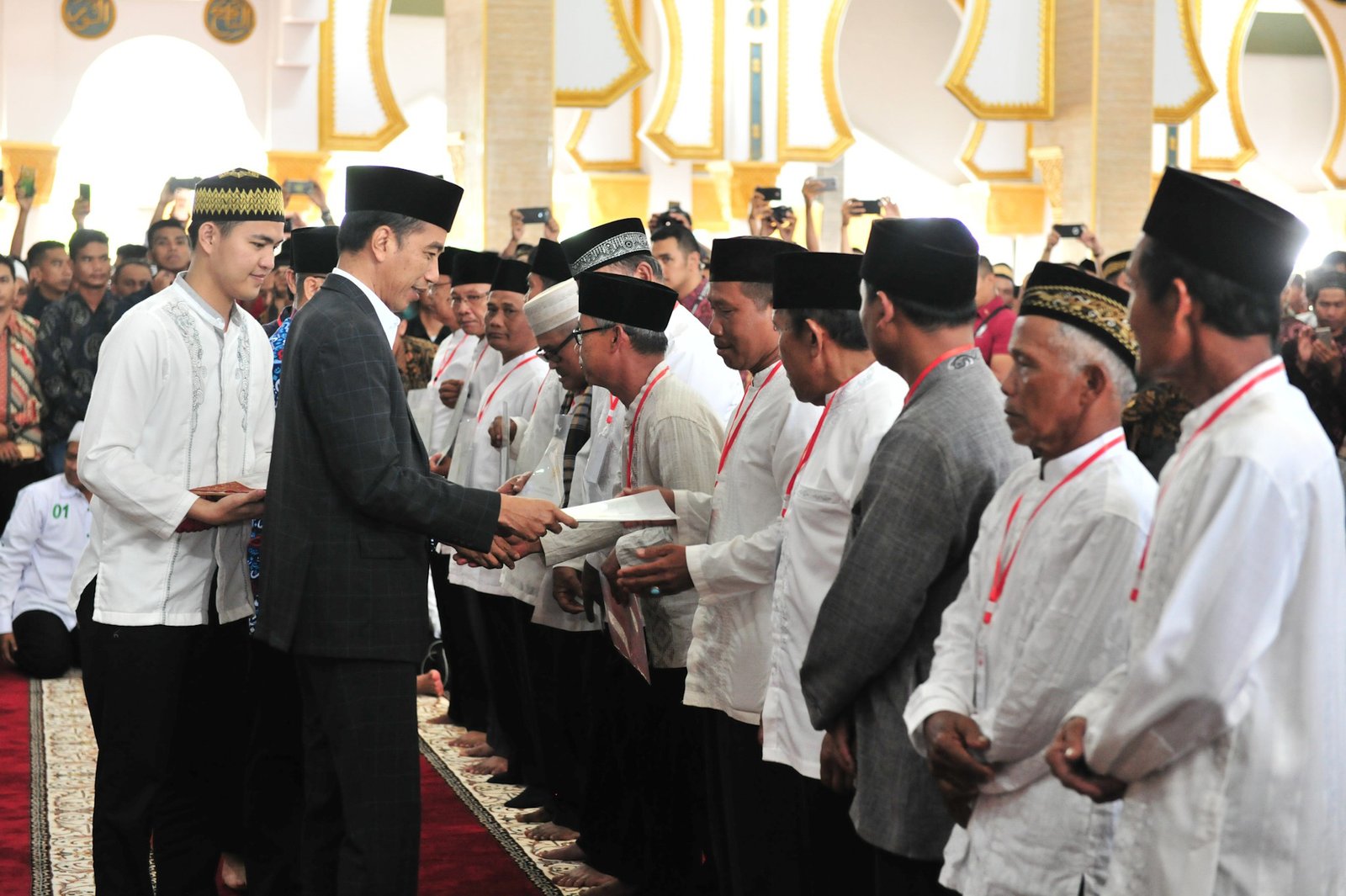 Presiden Jokowi menyerahkan sertifikat tanah wakaf, di Masjid Baitul Izzah, Padang Harapan,…
