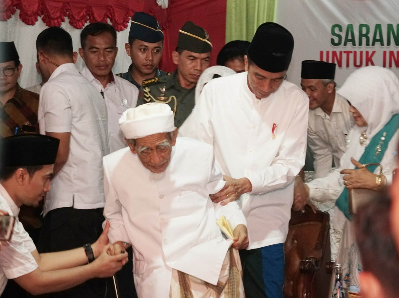 Presiden Jokowi membantu K.H. Maimoen Zubir duduk saat menghadiri acara Sarang Berzikir…