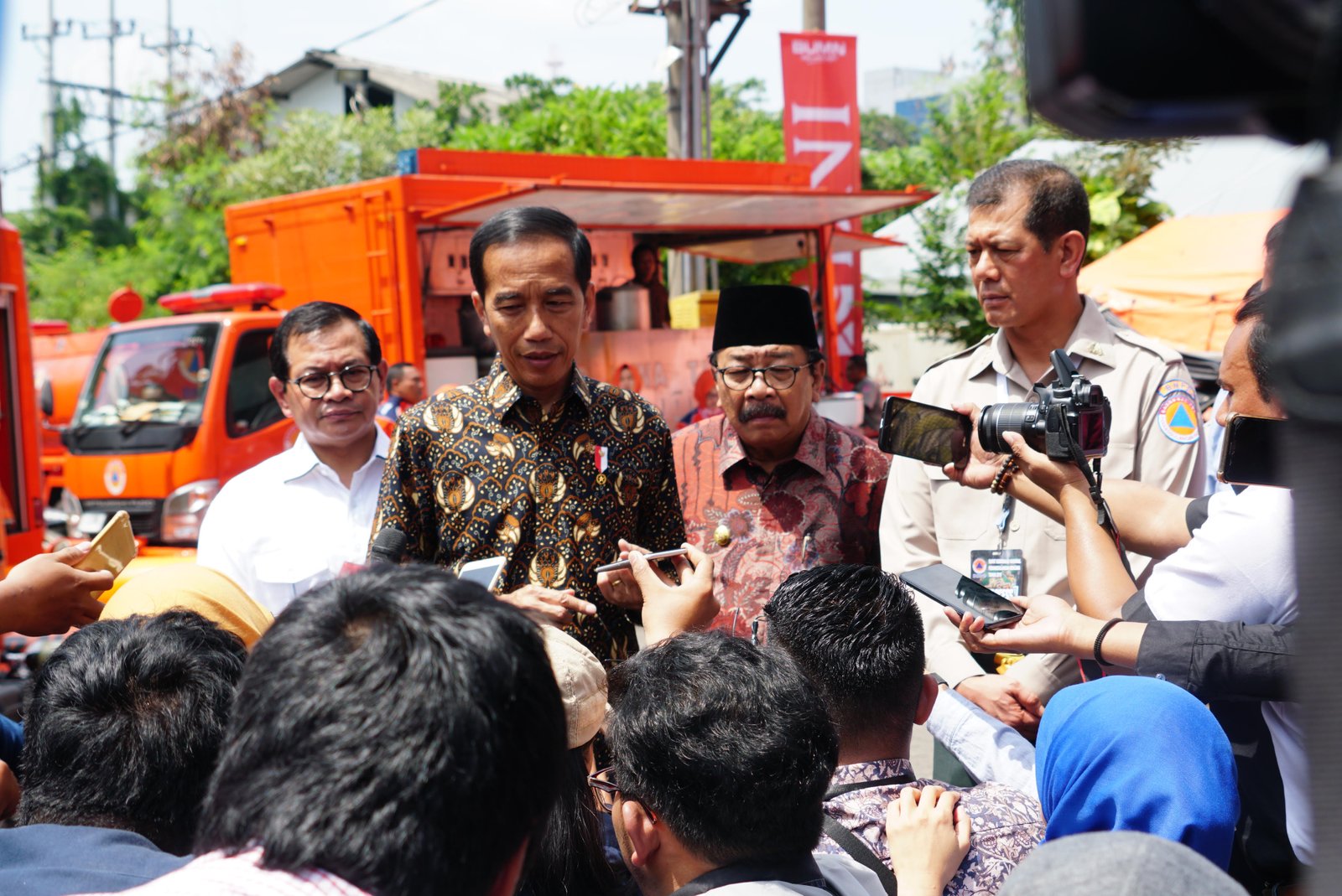 Presiden Jokowi didampingi Seskab, Kepala BNPB, dan Gubernur Jatim menjawab wartawan, di…