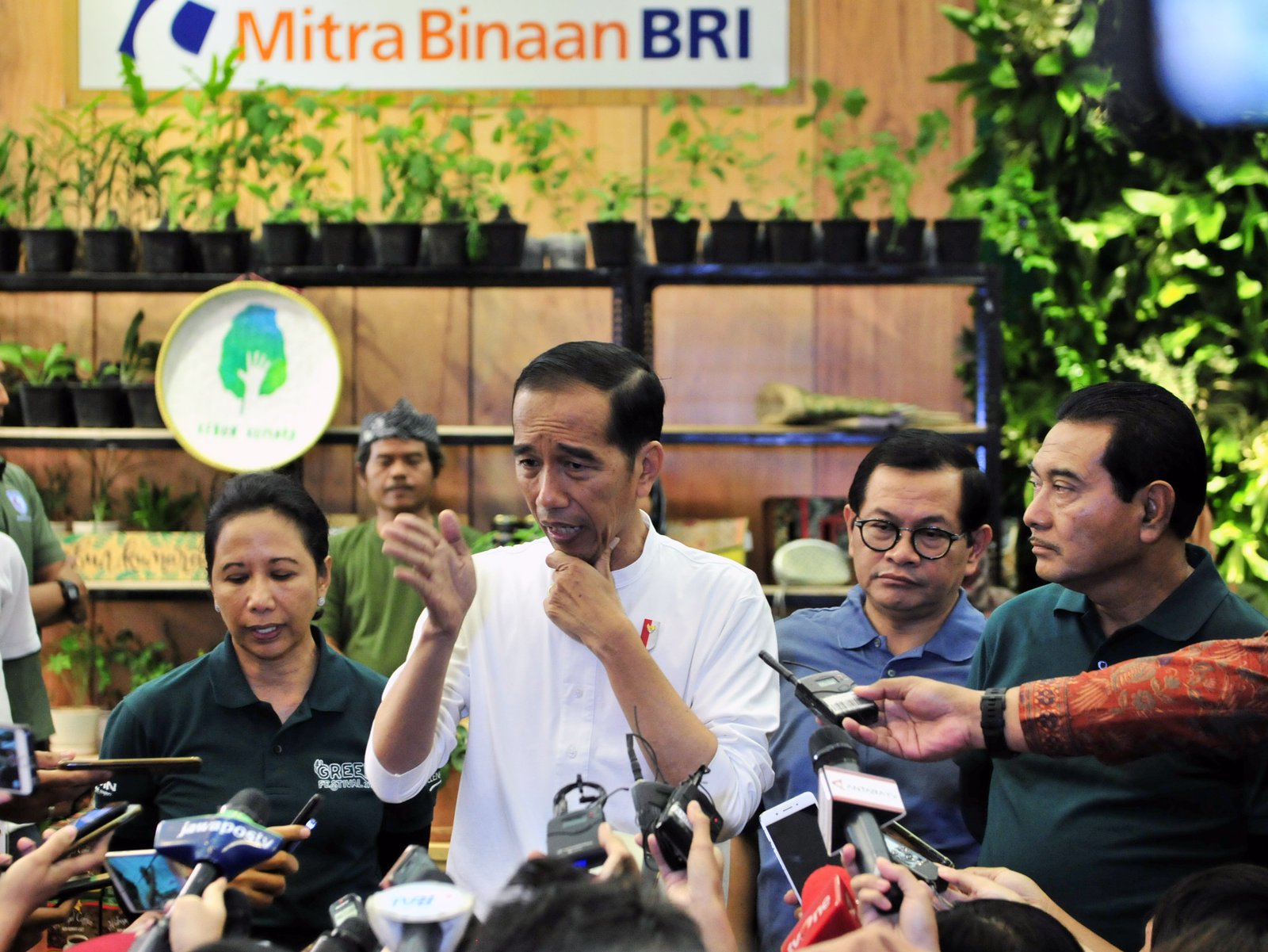 Presiden Jokowi didampingi Seskab dan Menteri BUMN menjawab wartawan usai membuka Green…