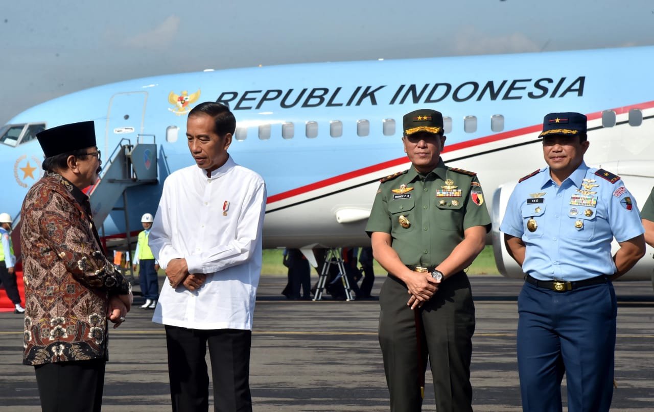 Presiden Jokowi berbincang dengan Gubernur Jatim Soekarwo yang menjemputnya di Pangkalan TNI…