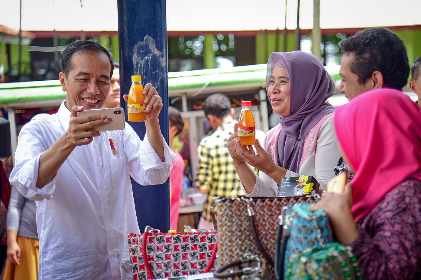 Presiden Jokowi berswafoto dengan produk salah satu peserta program Mekaar, di Muara…
