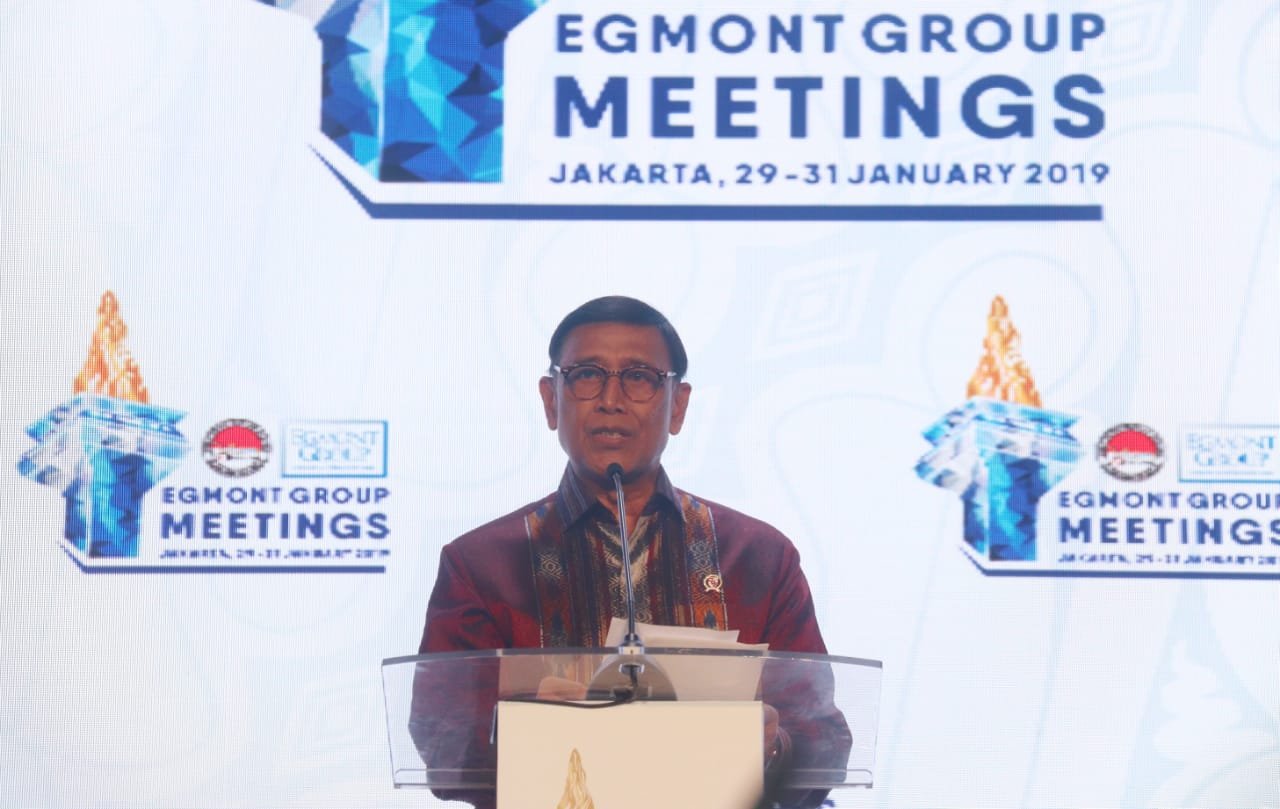 Menko Polhukam Wiranto memberikan sambutan pada Egmont Meeting Group 2019 di Jakarta,…