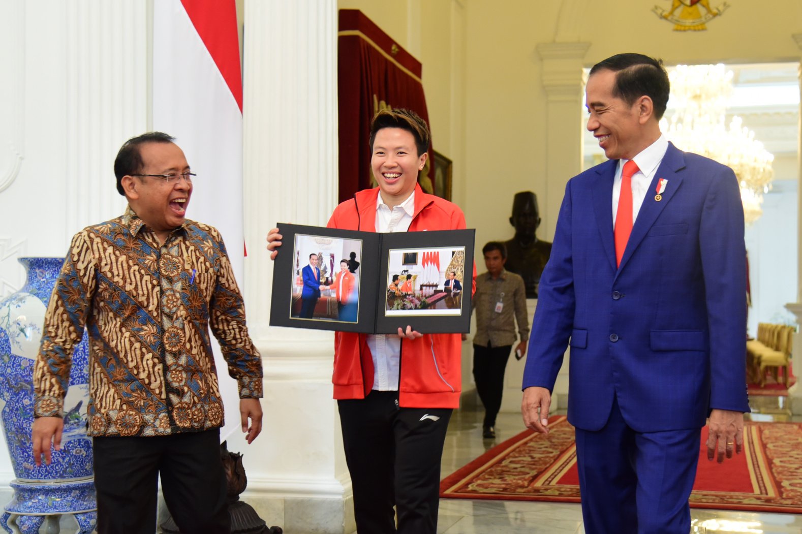 Liliyana Natsir bersama Presiden Jokowi dan Mensesneg Pratikno menunjukkan foto pertemuan dirinya,…