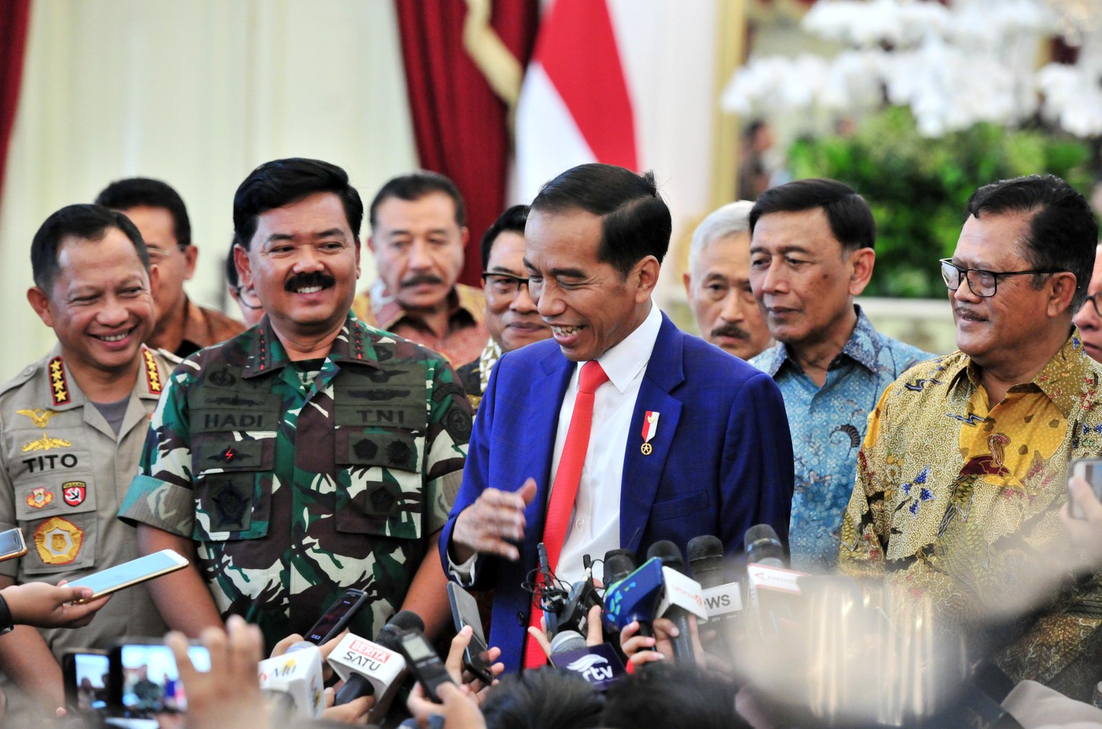 Presiden Jokowi didampingi Panglima TNI, dan Kapolri menjawab wartawan usai membuka Rapim…