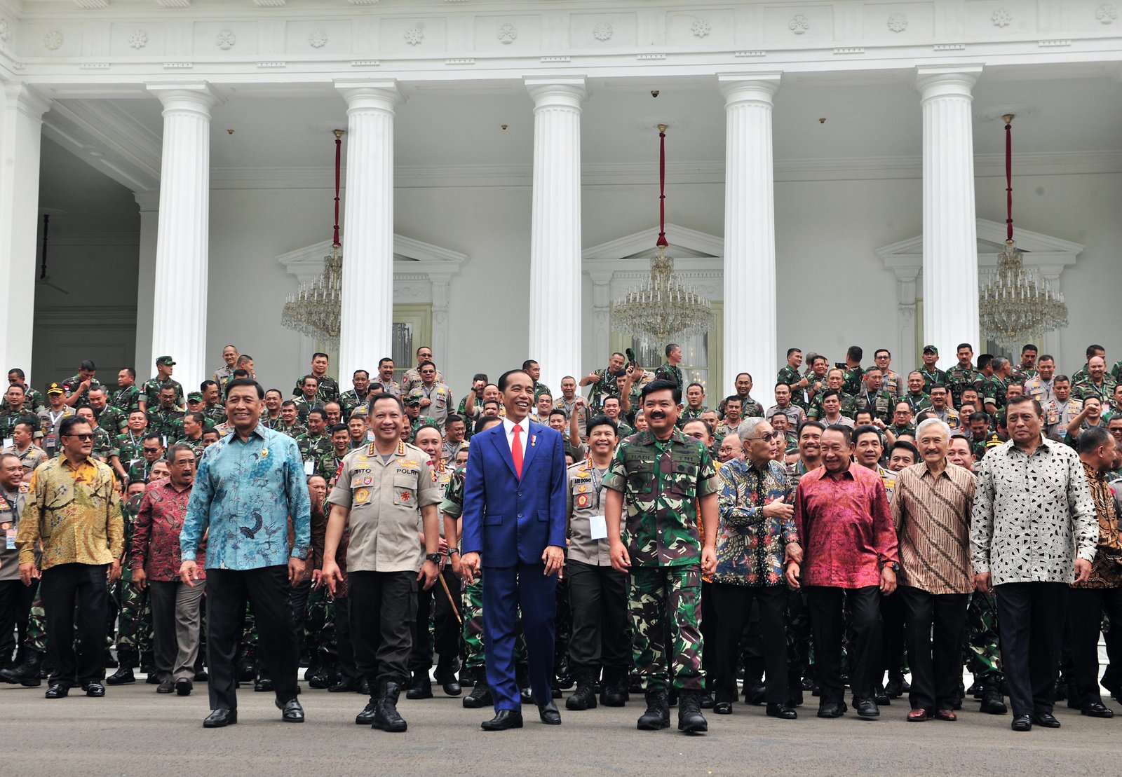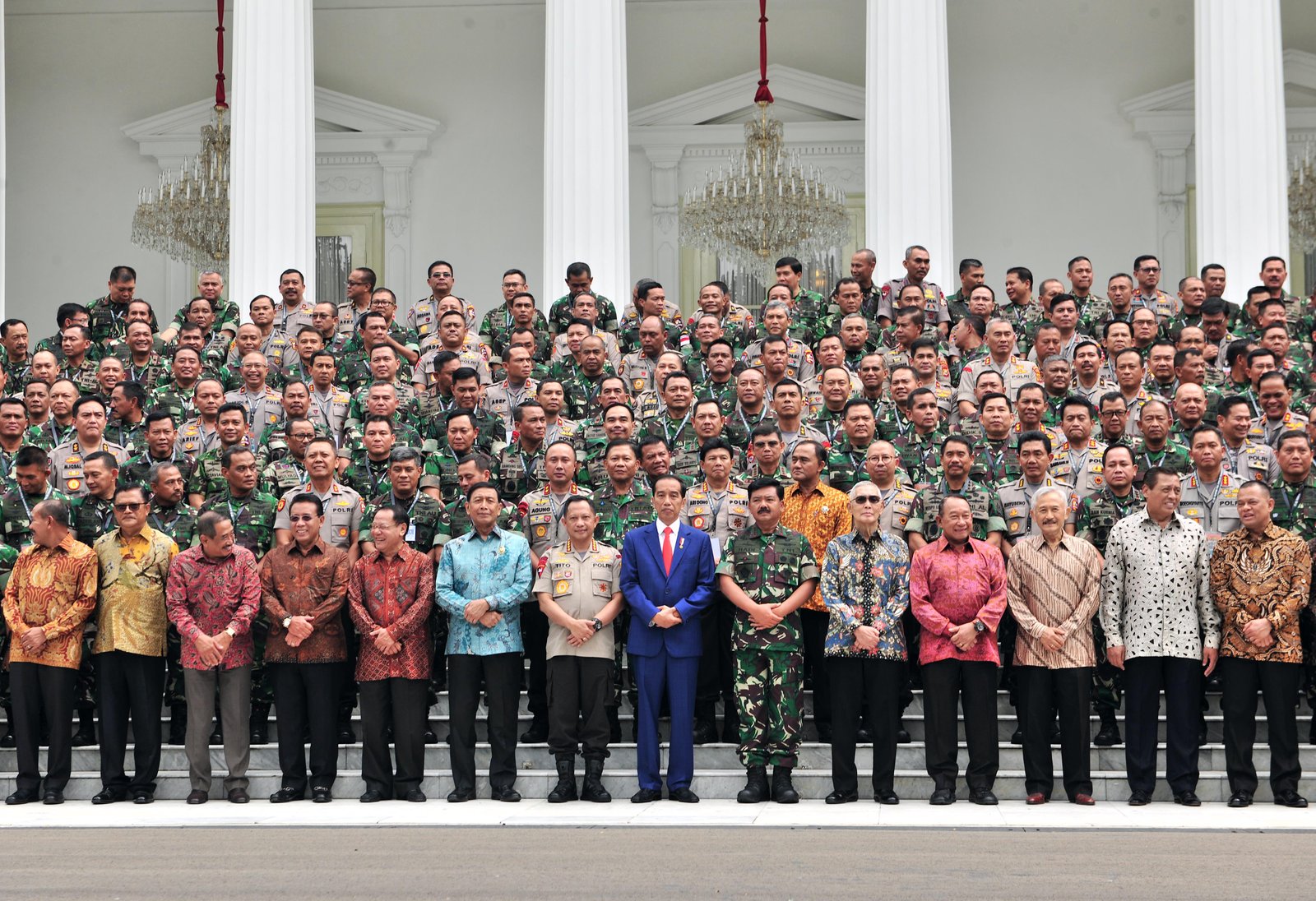 Presiden Jokowi berfoto bersama peserta Rapim TNI-Polri 2019, di halaman Istana Merdeka,…