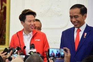 Liliyana Natsir bersama Presiden Jokowi menjawab wartawan usai bertemu di Istana Merdeka,…