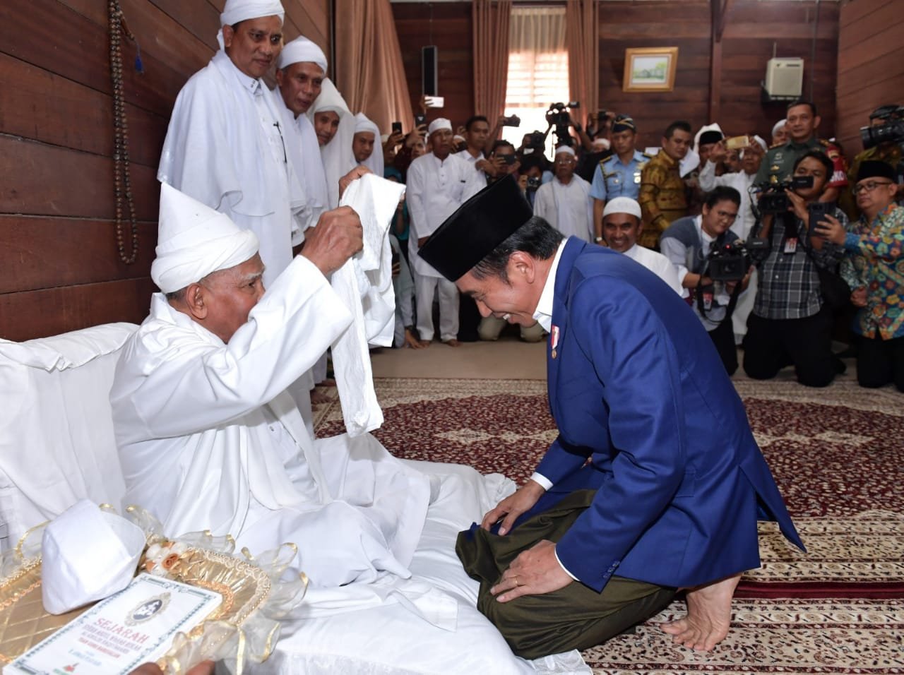 Presiden menerima kalungan sorban saat bersilaturahmi ke kediaman Syekh Haji Hasyim Al-Syarwani…