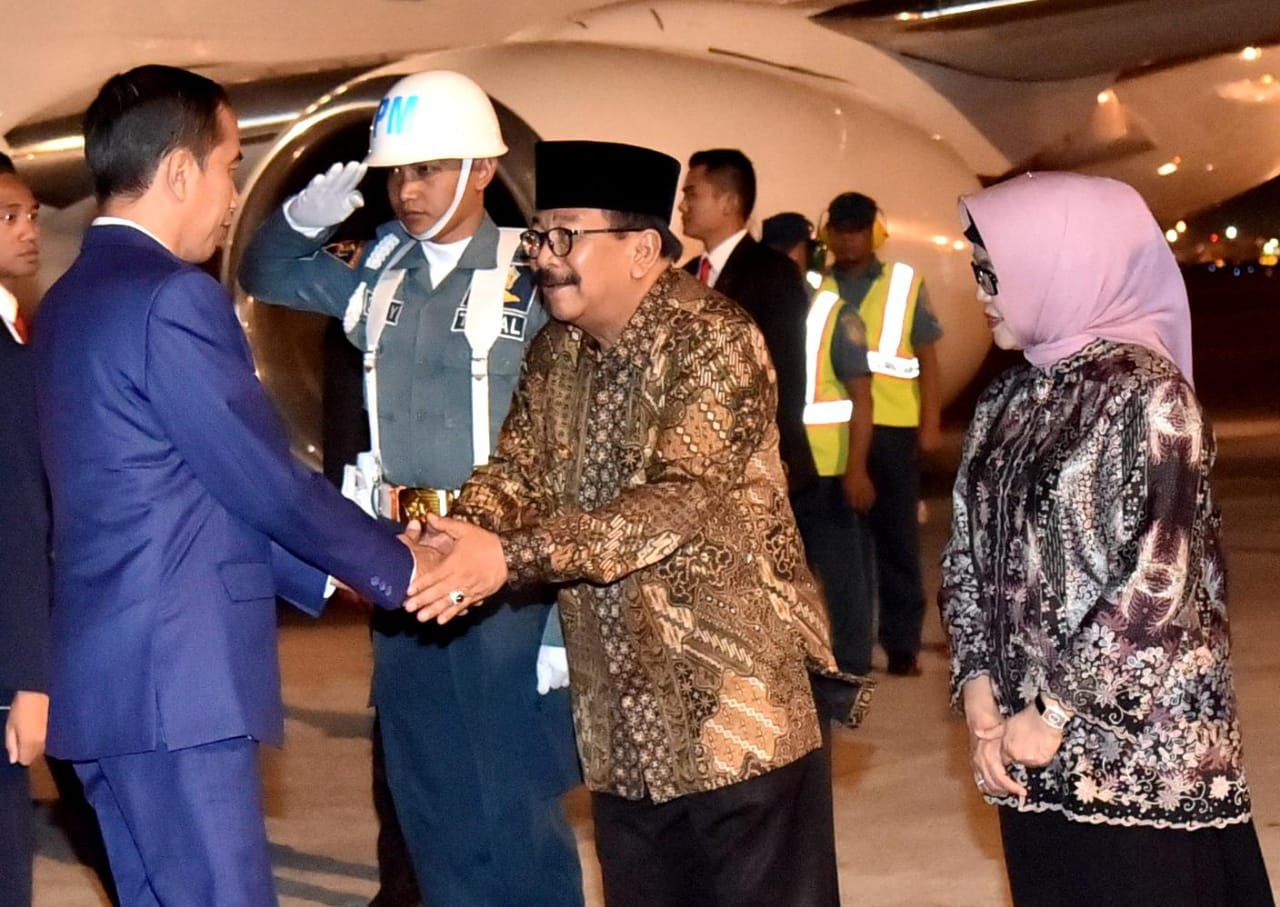 Presiden Jokowi disambut Gubernur Jawa Timur Soekarwo saat di Bandar Udara Internasional…