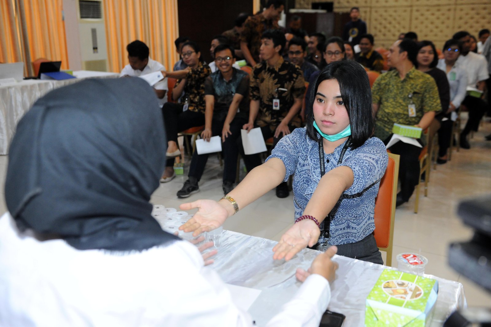 Salah satu pegawai Sekretariat Kabinet mengikuti pelaksanaan tes urine di Aula Serba…