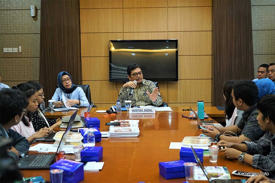 Sekjen Kemenkeu Hadiyanto menyampaikan keterangan pers di Ruang Press Kemenkeu, Jakarta, Rabu…