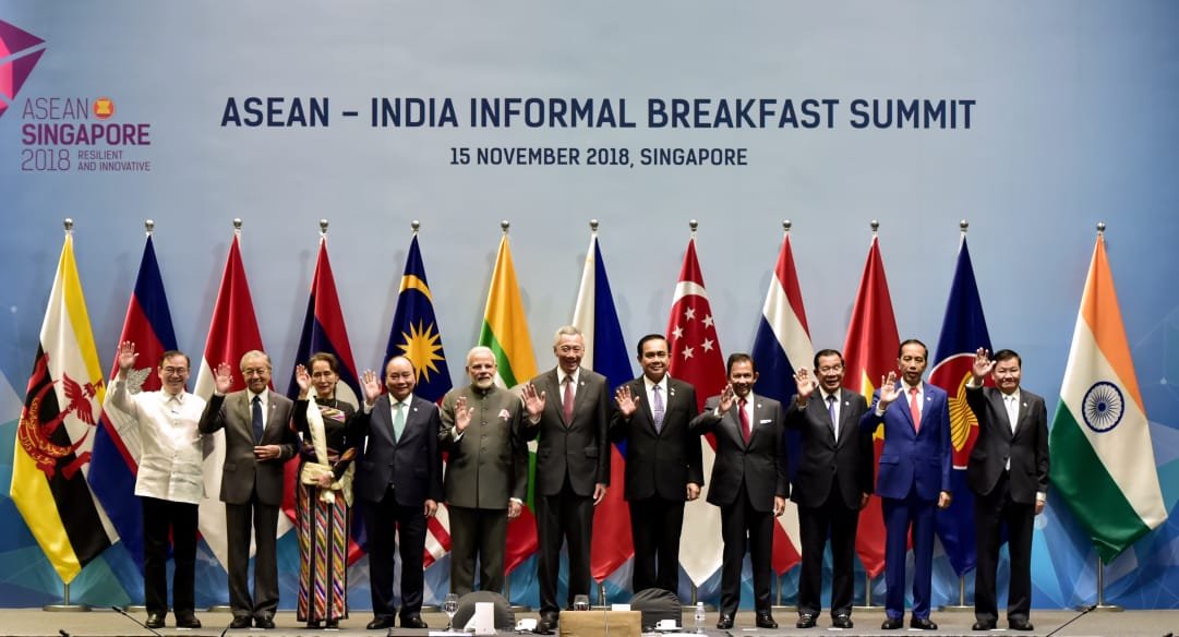 Presiden Jokowi berfoto bersama dalam agenda KTT ASEAN-India di Suntec Convention Centre,…