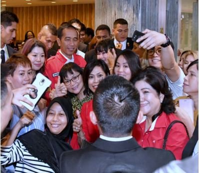 Presiden Jokowi melayani permintaan foto bersama warga Indonesia, usai makan siang di…