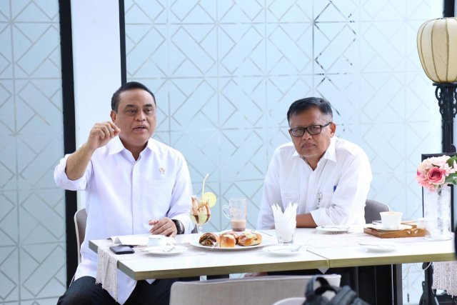 Menteri PANRB Syafruddin didampingi Sesmen PANRB menyampaikan keterangan pers, di kantor Kementerian…