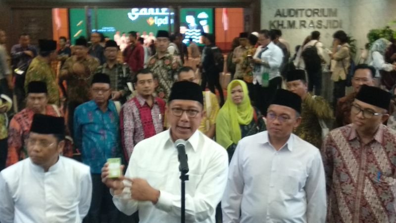 Menag Lukman Hakim Saifuddin menunjukkan Kartu Nikah pada konperensi pers, di auditorium…