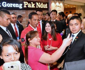 Presiden Jokowi diajak berfoto bersama warga saat makan siang di rumah makan…
