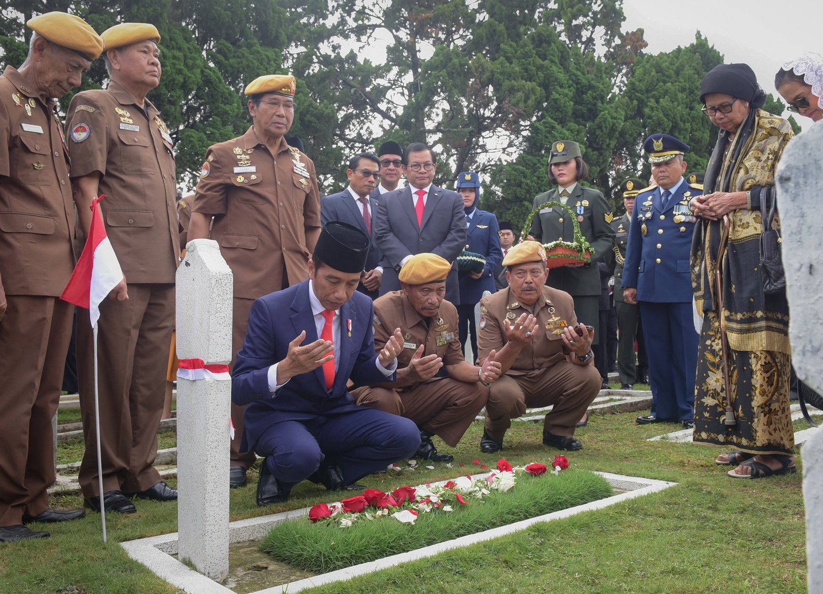 Presiden Jokowi saat melaksanakan tabur bunga di Taman Makam Pahlawan (TMP) Cikutra,…