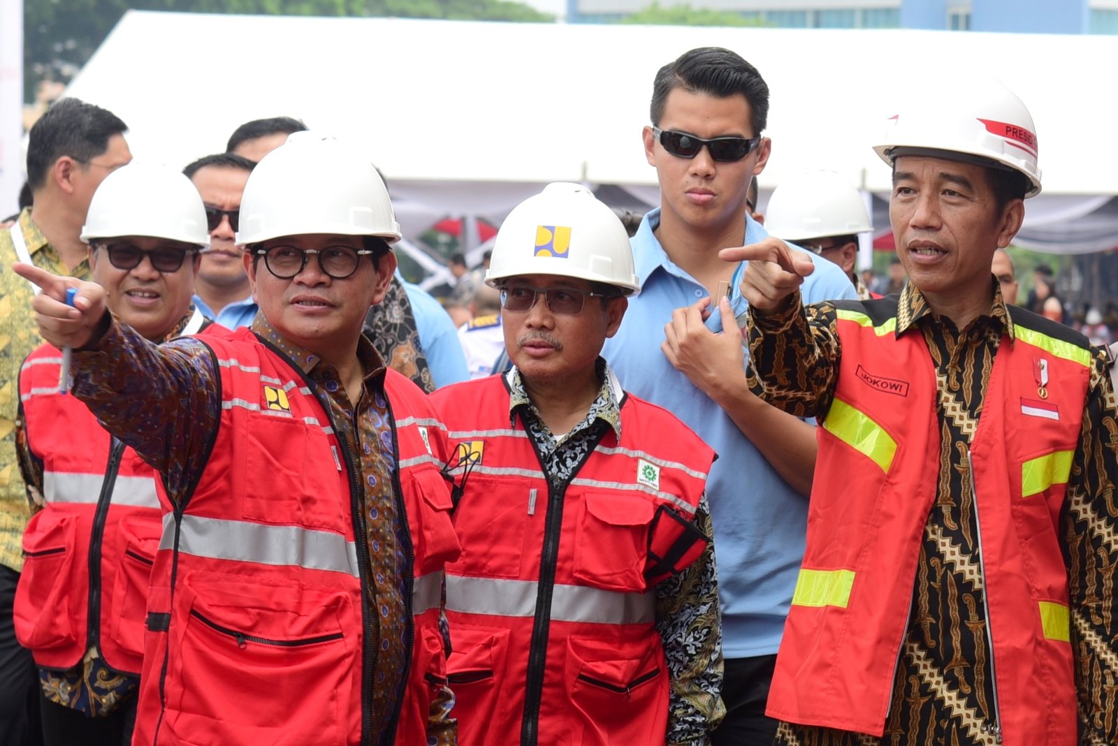 Presiden Jokowi dan Seskabb Pramono Anung menunjuk sesuatu saat membukaPameran Konstruksi Indonesia…