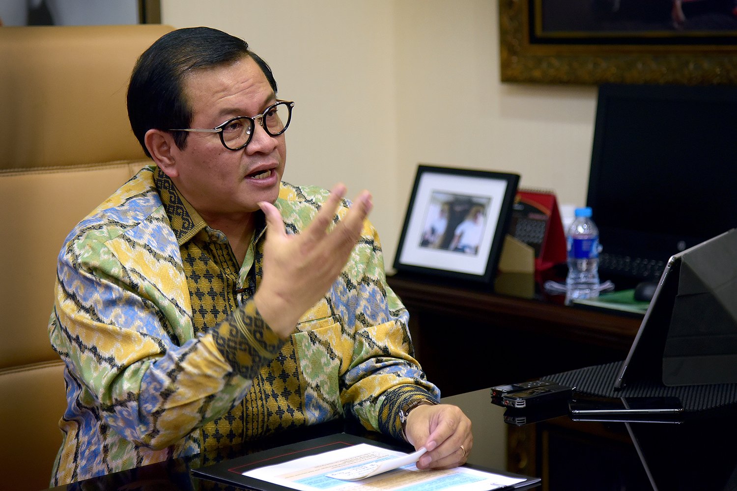 Seskab Pramono Anung menjawab pertanyaan menyambut Hari Sumpah Pemuda 2018, di ruang…