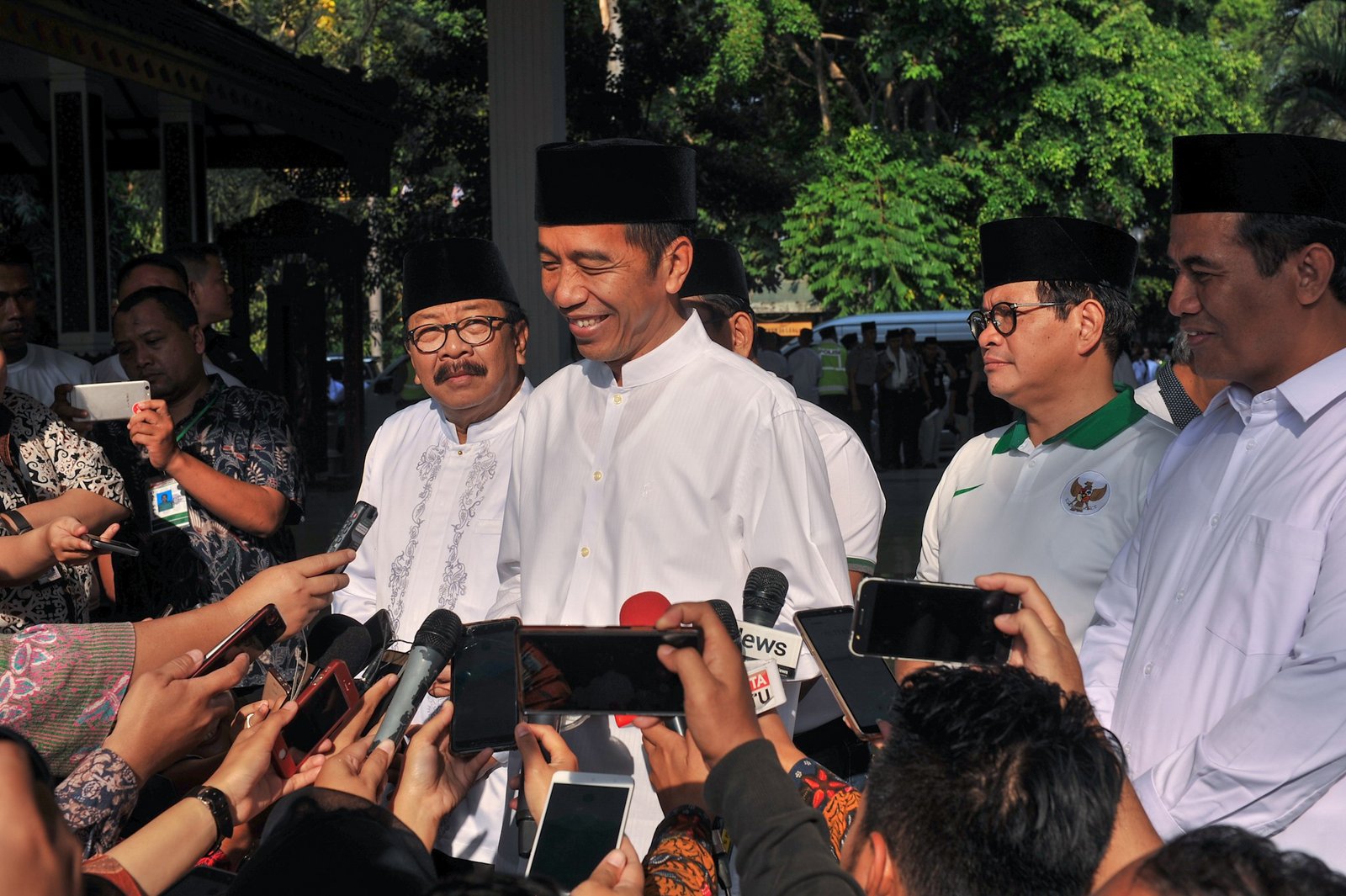 Presiden Jokowi menjawab wartawan usai melepas Jalan Sehat Santri Sahabat Rakyat, di…