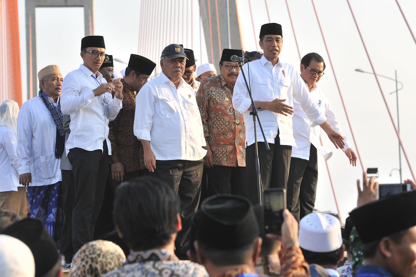 Presiden Jokowi meresmikan pembebasan biaya melalui Jalan Tol Suramadu, di Bangkalan, Jatim,…