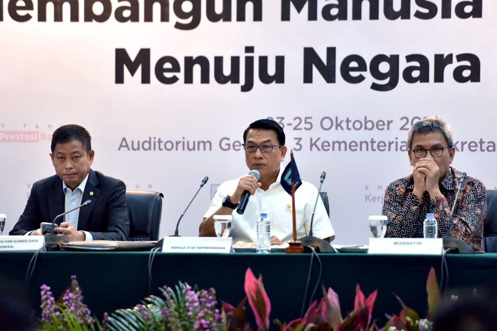 Menteri ESDM Ignasius Jonan duduk disampaikan KSP Moeldoko sebelum menyampaikan paparan dalam…
