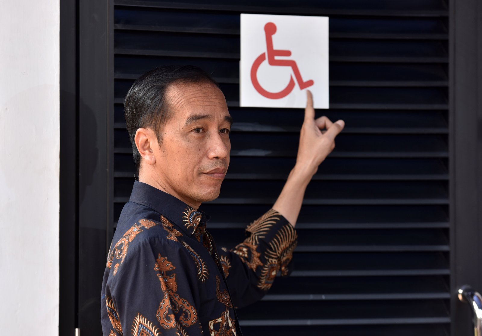Presiden Jokowi menunjuk contoh salah satu fasilitas umum yang ramah bagi penyadang…