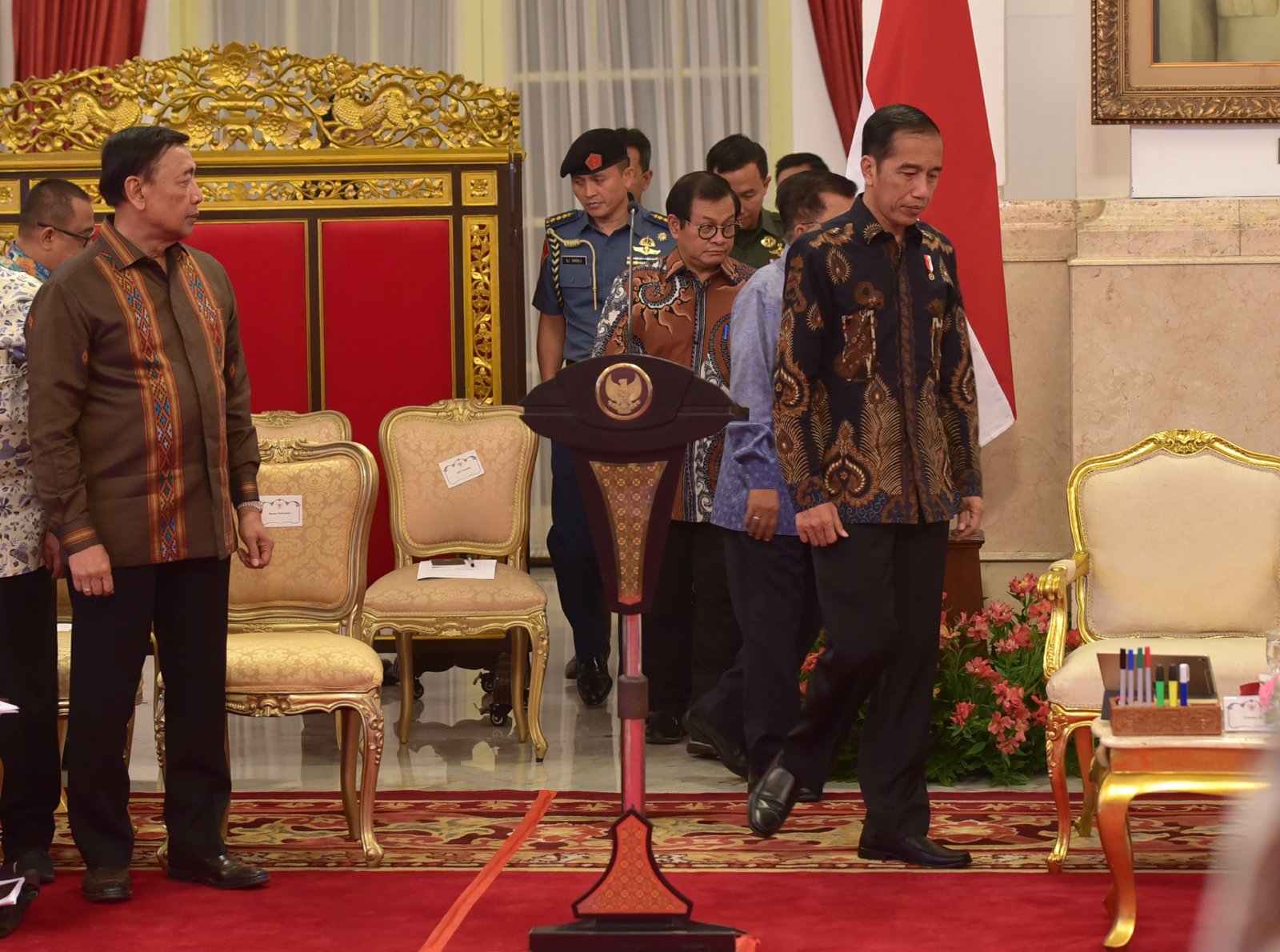 Presiden Jokowi bersama Wakil Presiden Jusuf Kalla memasuki Istana Negara, untuk memimpin…