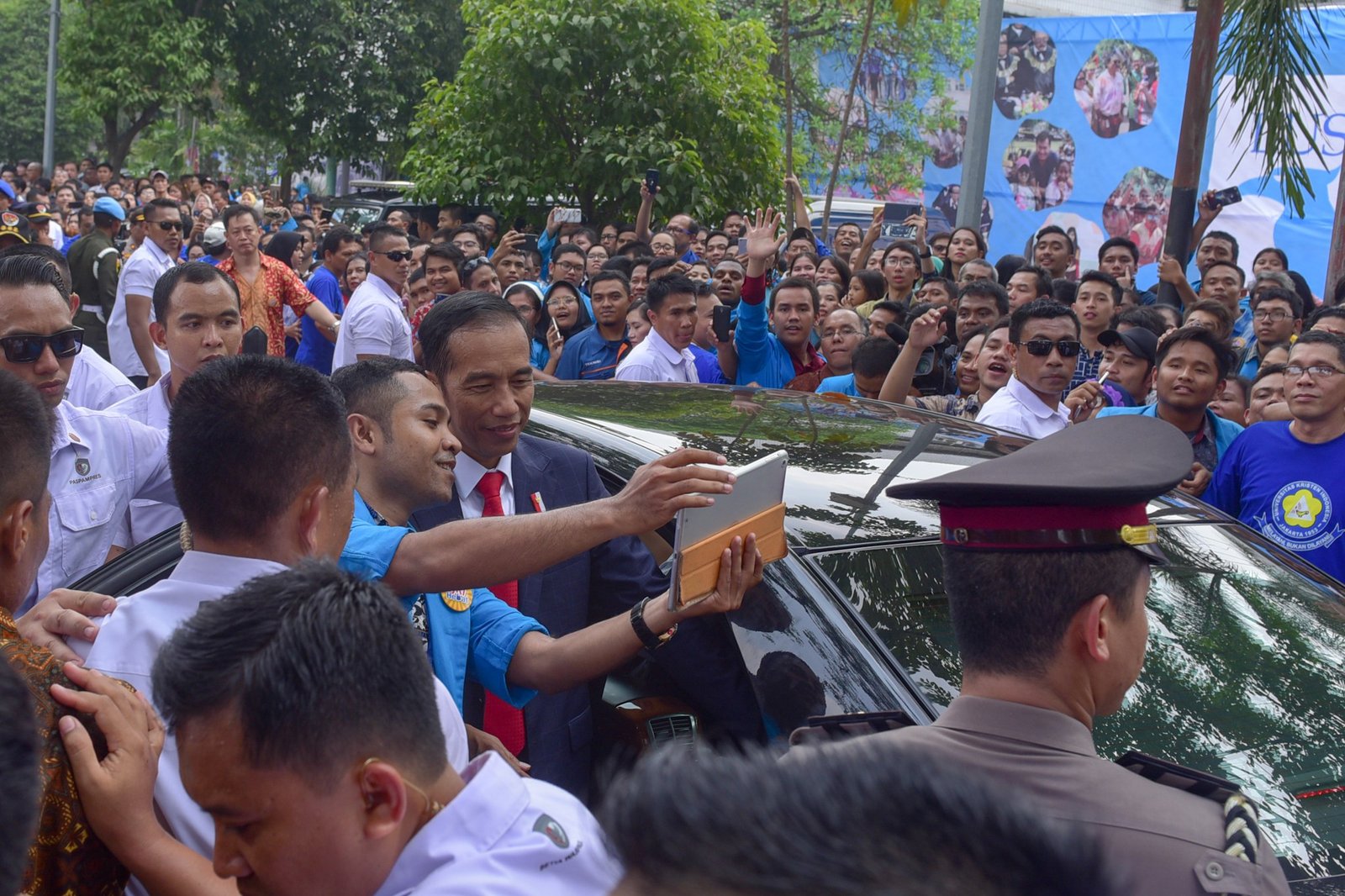 Presiden Jokowi menerima permintaan seorang mahasiswa untuk berfoto bersama, usai memberikan orasi…
