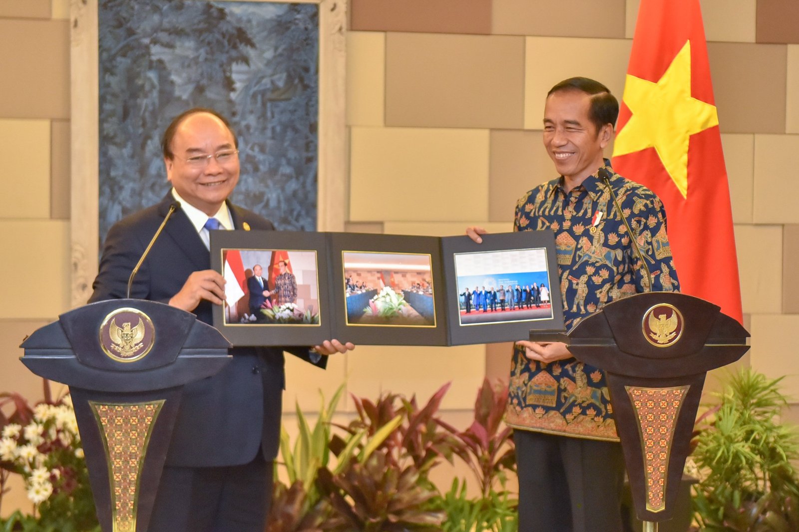 Presiden Jokowi berfoto bersama sembari menunjukkan foto-foto dokumentasi keduanya, di BNDCC, Nusa…