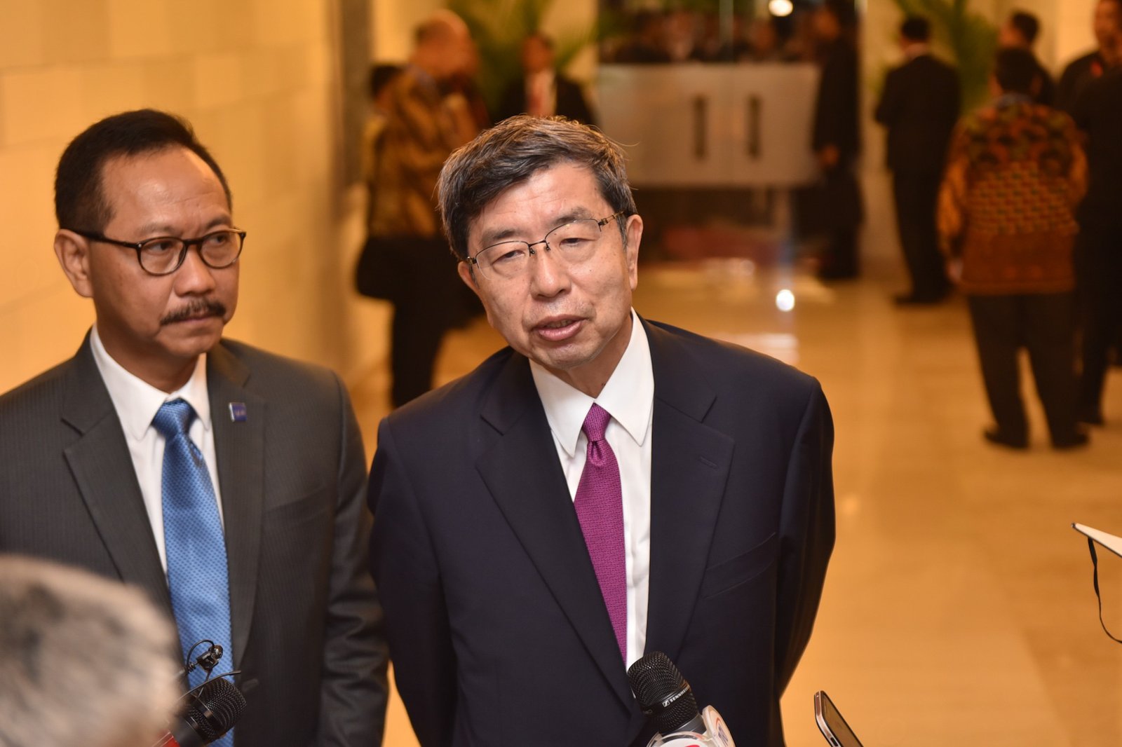 Presiden ADB Takehiko Nakao didampingi tokoh perbankan Indonesia, Sigit Pramono, menjawab wartawan…