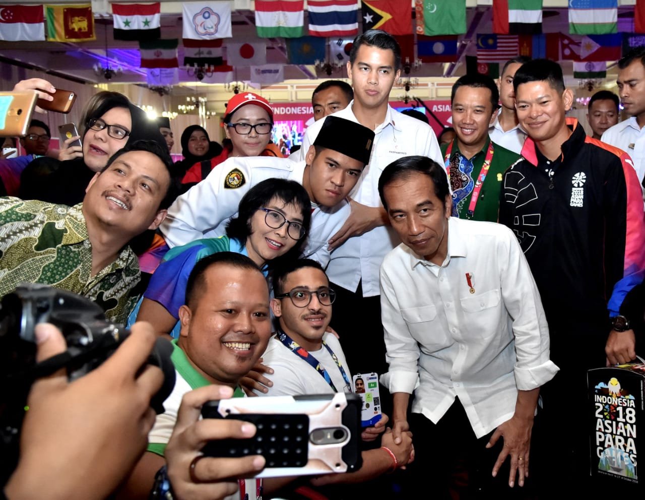 Presiden Jokowi berfoto bersama para atlet saat meninjau pertandingan Asian Para Games,…