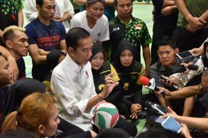 Presiden Jokowi didampingi atlet voli duduk menjawab wartawan di Stadion GBK, Jakarta,…