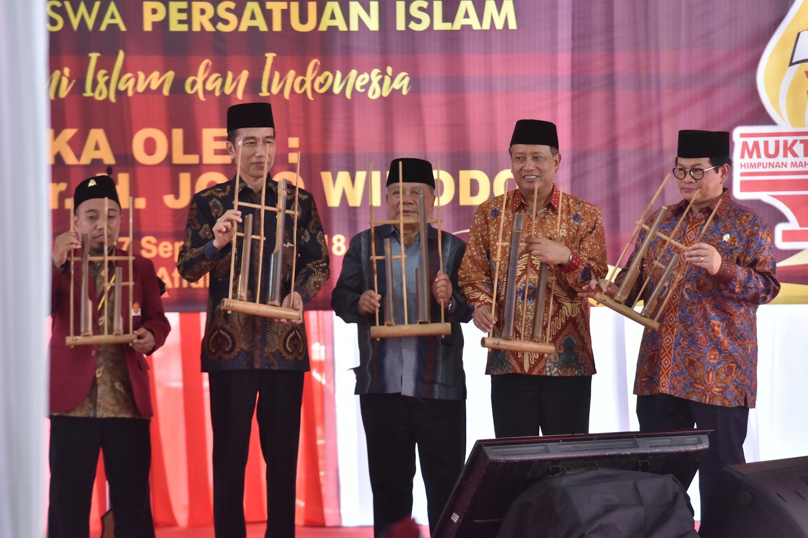 Presiden Jokowi didampingi sejumlah menteri dan pimpinan Persis memainkan angklung saat membuka…