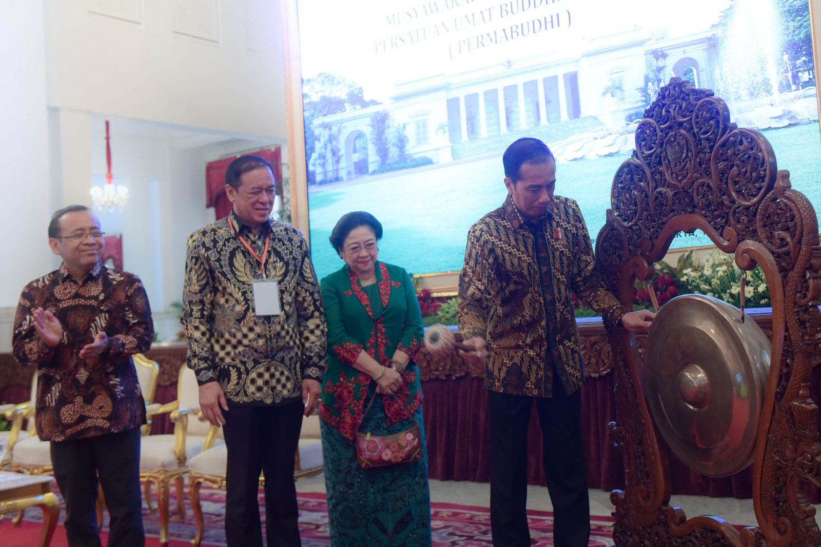 Presiden Jokowi memukul gong tanda dimulainya Munas I Permabudhi 2018, di Istana…