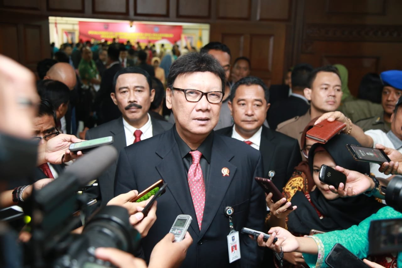Mendagri, Tjahjo Kumolo menjawab pertanyaan wartawan, di Jakarta, Sabtu (8/9). (Foto: Kemendagri).…