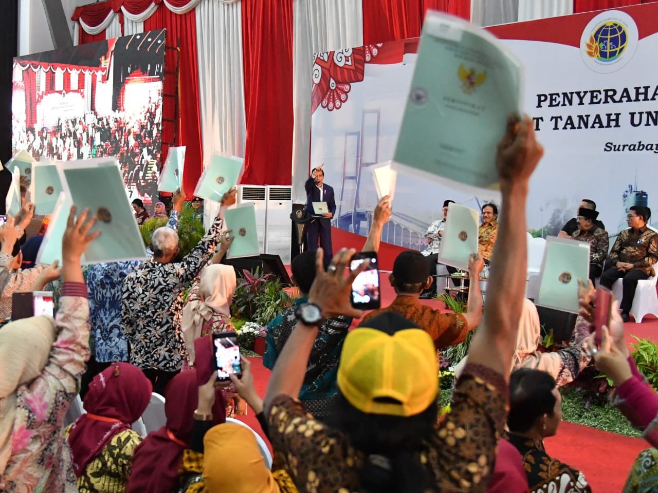 Presiden Jokowi menghitung sertfikat yang dipegang masyarakat dalam acara penyerahan 5.000 sertifikat…
