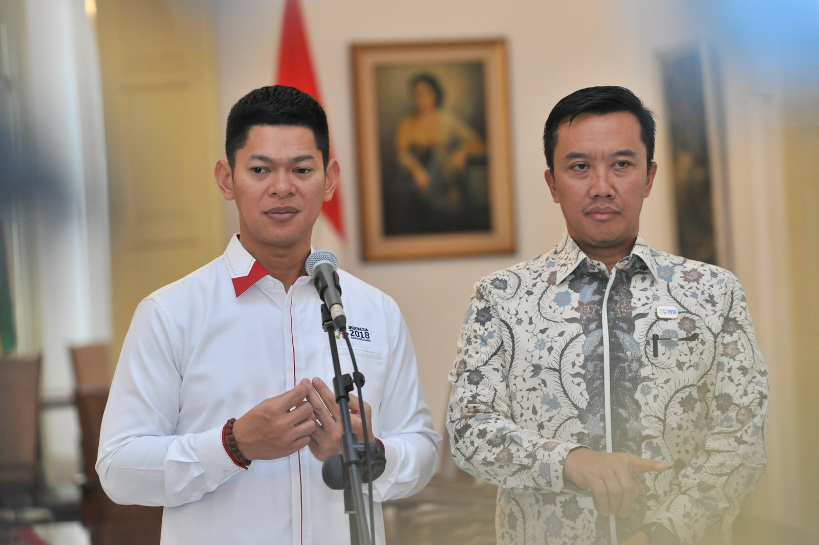 Ketua INAPGOC Raja Oktohari didampingi Menpora Imam Nahrawi menyampaikan keterangan pers, d…