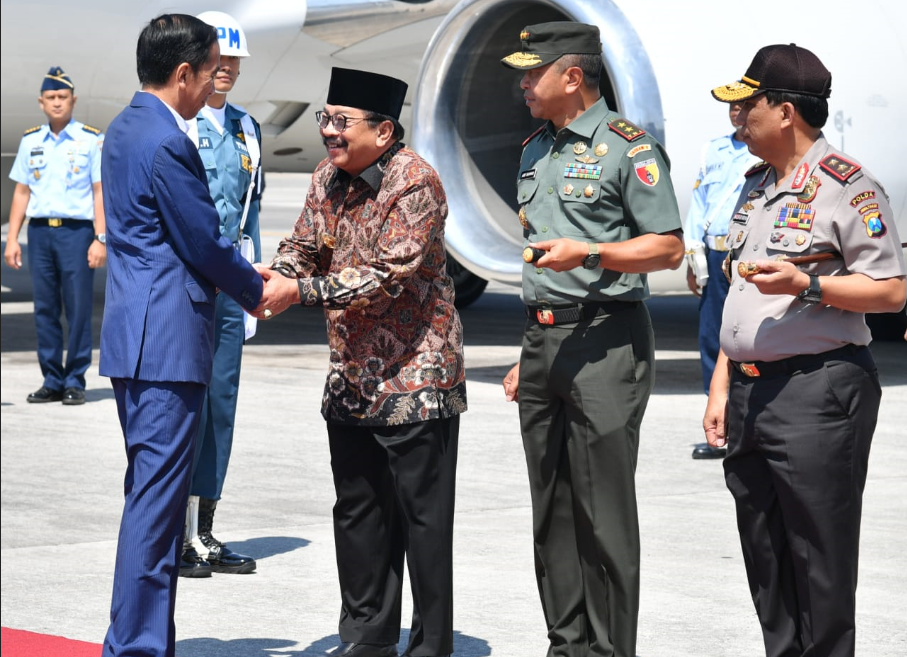 Presiden Jokowi disambut Gubernur Jatim Soekarwo saat tiba di Bandara Juanda, Surabaya,…